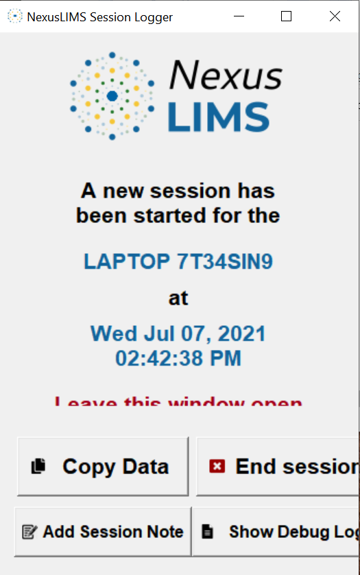 To accurately know what files should be included in each Experiment’s record, it is important to have a timestamp for the beginning and end of when a user has collected data. To facilitate collecting this information, a small application has been written that is run from the microscope support (or control) PC and logs basic session information to the NexusLIMS database. This document explains how this application is used, its design, what information it collects, and how it is deployed to the individual microscopes.