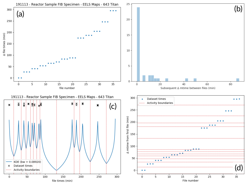 To separate the list of files into groups, a statistical analysis of the file creation times is performed, as illustrated in Fig. 1 for an example experiment consisting of groups of EELS spectrum images. In (a), the difference in creation time (compared to the first file) for each file is plotted against the sequential file number. From this, it is clear that there are 13 individual groupings of files that belong together (the first two, then next three, three after that, and so on...). These groupings represent files that were collected near-simultaneously, and each group is a collection of files (EELS, HAADF signal, and overview image) from slightly different areas. In (b), a histogram of time differences between consecutive pairs of files, it is clear that the majority of files have a very short time difference, and the larger time differences represent the gaps between groups.