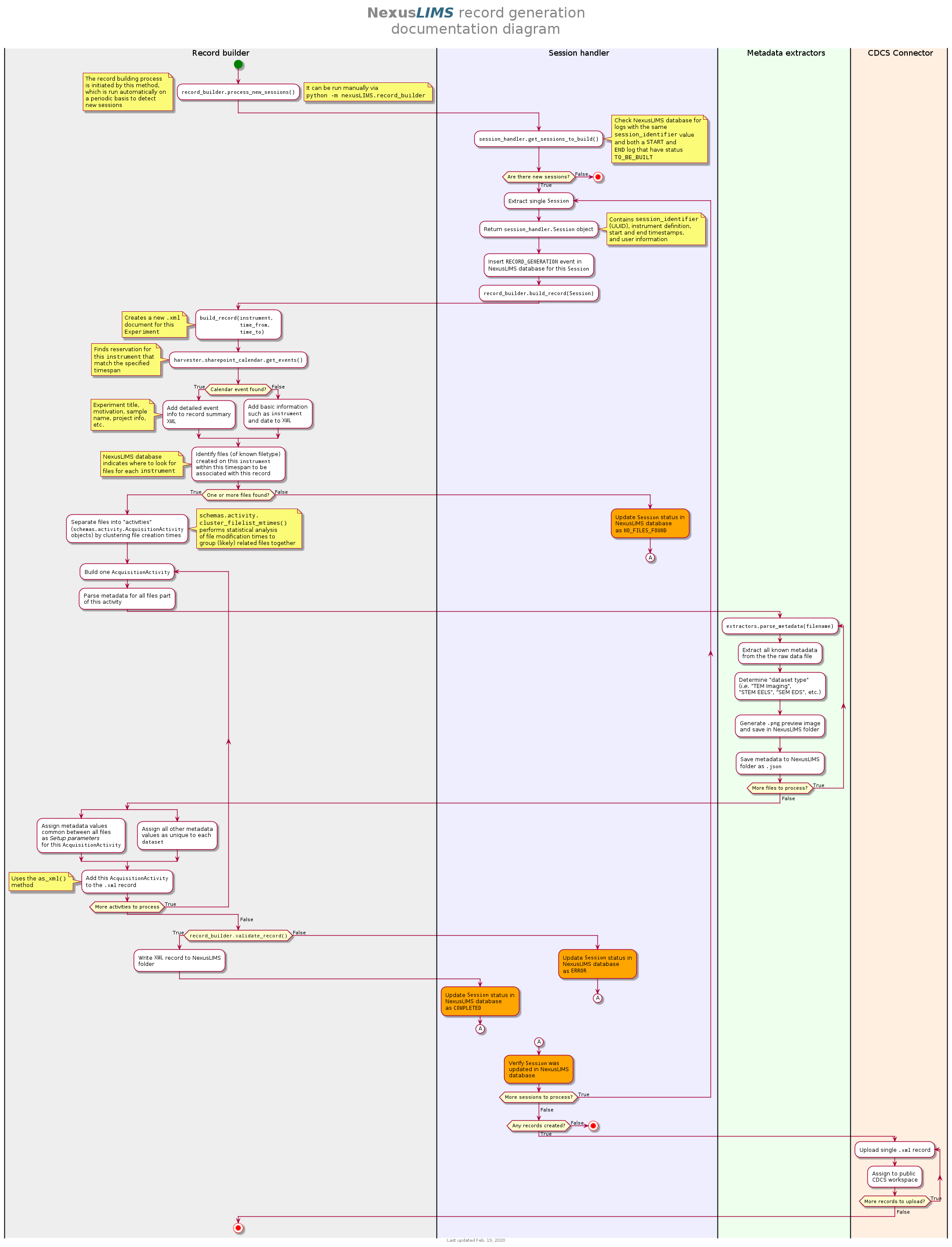 This page describes the process used to build records based on the data saved by instruments in the Electron Microscopy Nexus facility using NexusLIMS. At the bottom is an activity diagram that illustrates how the different modules work together to generate records from the centralized file storage and the NexusLIMS session database. Throughout this page, links are made to the API Documentation as appropriate for further detail about the methods and classes used during record generation.