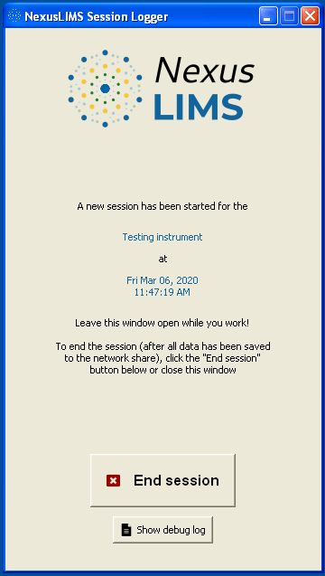To accurately know what files should be included in each Experiment's record, it is important to have a timestamp for the beginning and end of when a user has collected data. To facilitate collecting this information, a small application has been written that is run from the microscope support (or control) PC and logs basic session information to the NexusLIMS database. This document explains how this application is used, its design, what information it collects, and how it is deployed to the individual microscopes.