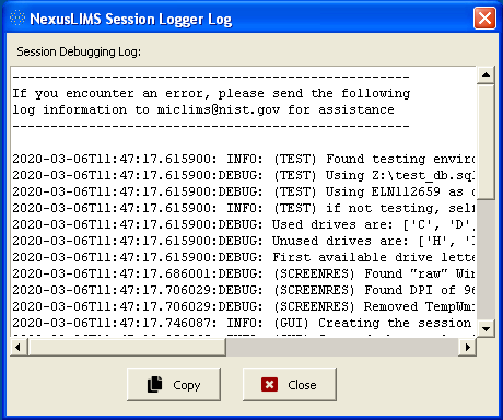 If this log window appears on its own (which it shouldn't), we ask that that you click the "Copy" button to copy all the text to the clipboard and send it to miclims@nist.gov so the NexusLIMS developers can resolve the issue.