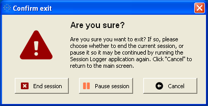 The session logger application does it's best to ensure that if the window is closed by any means, it sends an "End Session" log to the database. There is an option to "Pause Session" however, which is prompted if the regular "Close window" button is clicked: