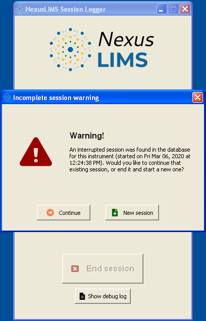 Clicking "Pause session" will immediately close the application without sending any further information to the database, and should only be done if the user plans to resume the session before another user will use the instrument (e.g. they need to restart the computer for some reason). Pausing the session will leave the database in an inconsistent state, which will be detected the next time the logger application is run. If this is the case, the user will be prompted to confirm whether they want to continue the existing session, or start a new one: